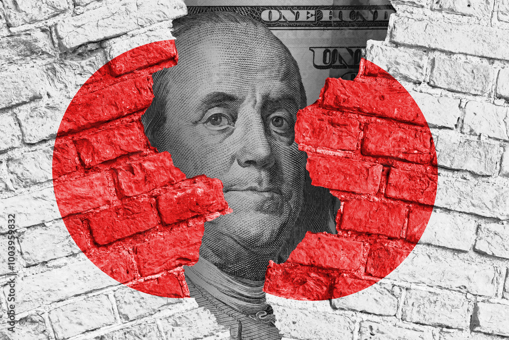 Economy of Japan. Fragment of dollar bill. Japan flag on brick wall. Concepts of breakdown of Japanese economy. Rift symbolizes financial crisis. Economic collapse in Japan. Bankruptcy, recession