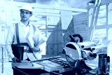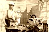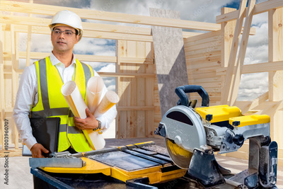 Man builder. Architect at construction site. Builder stands near table with circular saw. Architect building frame. Man builder holds papers with drawings. Architect in work uniform and helmet
