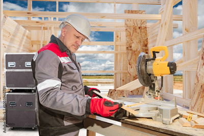 Man builder at work. Preparing boards at construction site. Builder guy inside wooden unfinished house. Man processes wood for construction. Construction worker working with circular saw