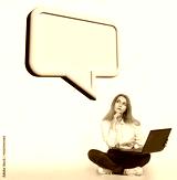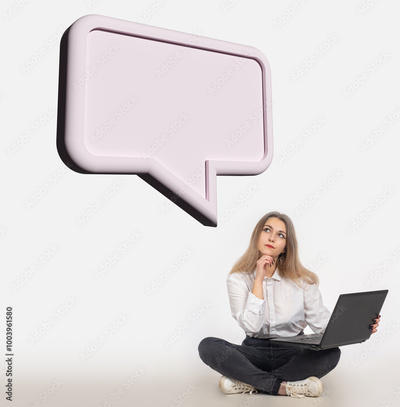 Woman with laptop thought about it. Dialogue block above student. Girl with computer sits on floor. Woman thought about text of message. Place for inscription. Copy space. Lady with talk bubble