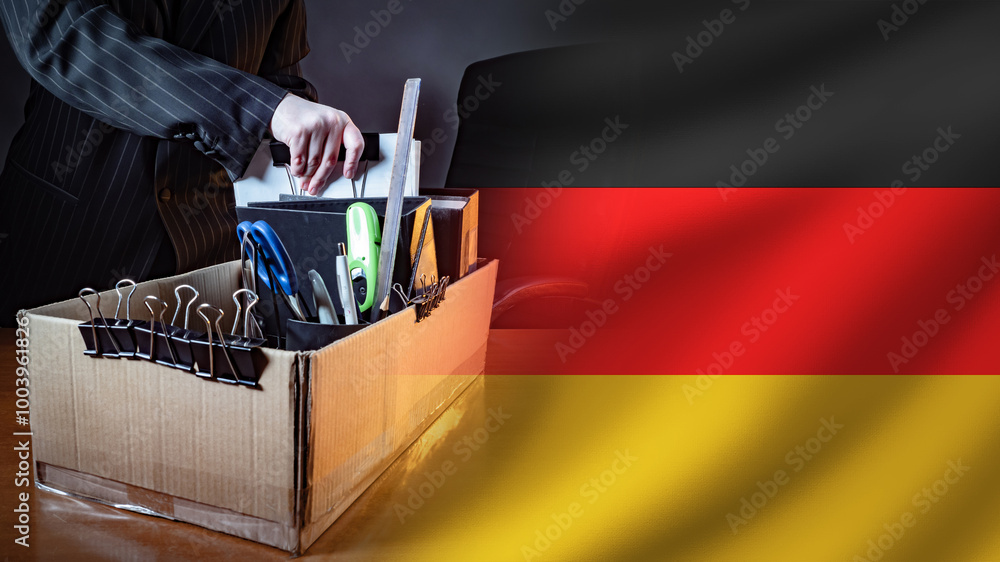 Dismissal people in Germany. Hands fired man near flag. Dismissal box with symbol Germany. Man collects personal belongings after dismissal. German unemployed manager with box. Problem worker layoffs