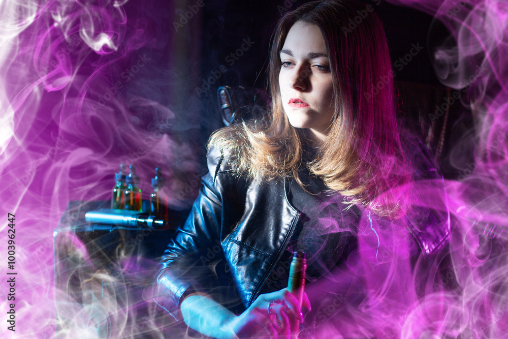 Woman vaper. Girl with vape device in her hand. Puffs of steam near smoker. Woman vaper in dark room. Vape oil behind lady. Young lady is interested in vaping. Vape hobby. Vaping process