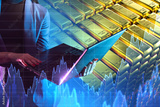 Investments in gold. Woman with laptop in her hands. Investor trades in precious metals market. Girl invests in gold. Purchasing precious metals on exchange. Making money from speculation with gold
