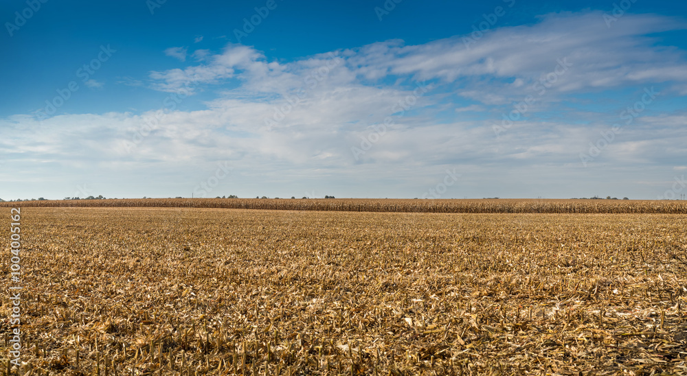 panoramic view of corn field, stubble after corn harvest with beautiful sky