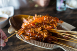 A hand holding fried prawns on skewers with tamarind sauce. The popular Thai seafood food