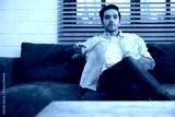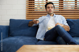 young handsome man watching movies and eating popcorn in a living room