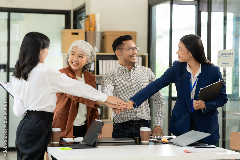 Group of business people celebrating success and shaking hands business concept, applaud motivation or celebrate in meeting, manager happy, successful and applaud for victory in support