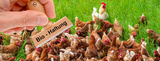 Ein Stempel beschriftet mit dem Aufdruck: Bio-Haltung über einer Herde Hühner mit Hahn in Freilandhaltung auf einer Wiese