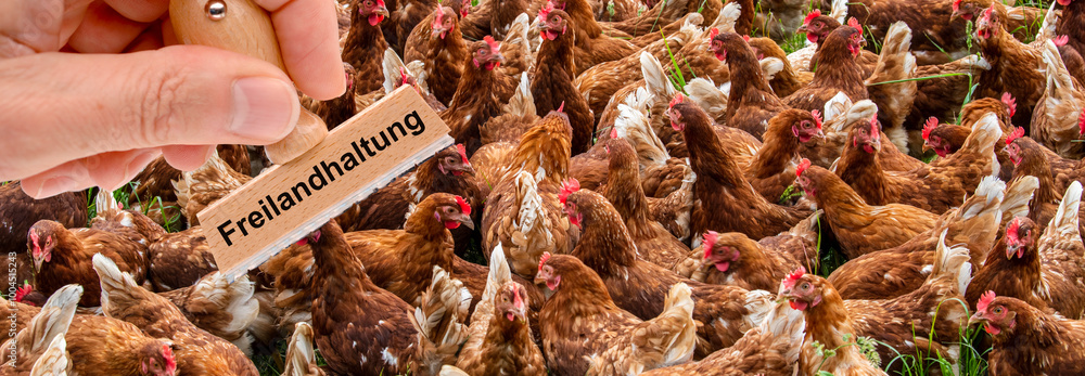 Ein Stempel beschriftet mit dem Aufdruck: Freilandhaltung über einer Herde Hühner auf einer Wiese