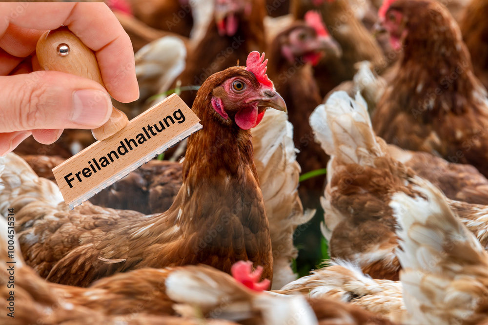 Ein Stempel beschriftet mit dem Aufdruck: Freilandhaltung über einer Herde Hühner auf einer Wiese