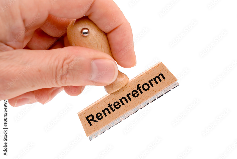 Ein Holzstempel ist beschriftet mit dem Aufdruck: Rentenreform