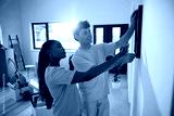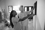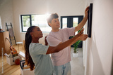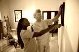 Young couple hanging paintings on wall of their new apartment.