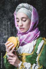 Medieval woman holding a burger.anachronism