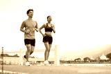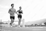 An active, sporty Asian couple in sportswear is jogging or running together in the park.