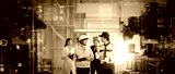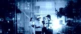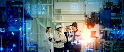 工場を歩く様々な職業の人々とデジタルテクノロジー バナー・広告向け横長ビジュアル