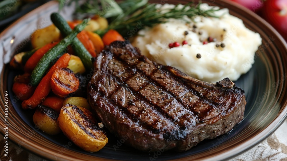 A beautifully arranged steak dinner on a stylish plate, with juicy grilled steak, roasted vegetables, and mashed potatoes, a feast for the eyes and palate.