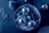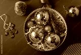 Christmas decorations in the round gift box with fir tree on the red background. Close up winter holidays greeting card.