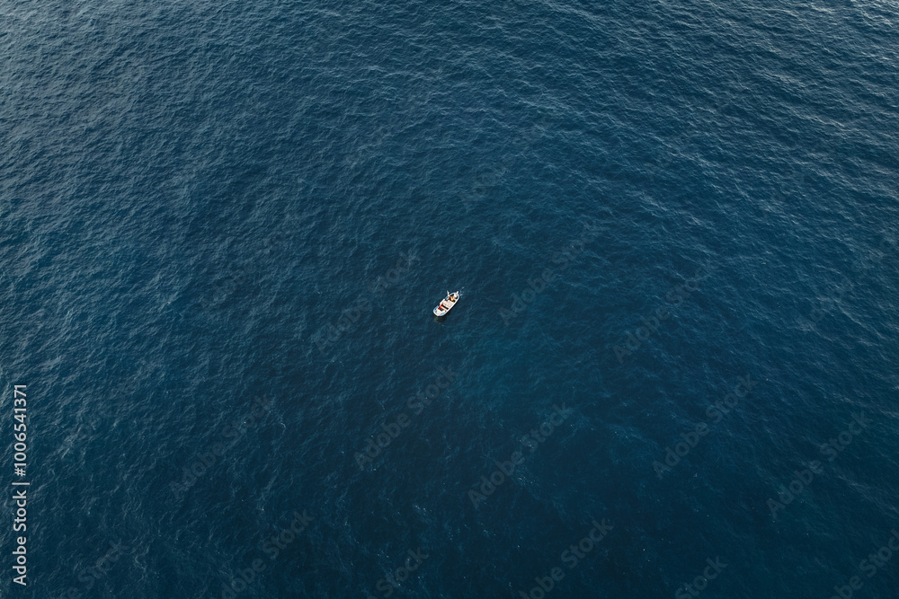 Aerial view of small fishing boat standing in the ocean - horizontal photo. Photo of green boat in the deep ocean water.