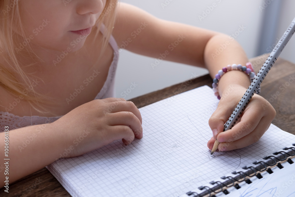 preschool girl 4 years old draws elements with pencil in checkered notebook, educational process, hand care, children's education, Creative Approach Education, Development Dexterity and Coordination