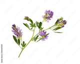 Purple flowers and green leaves of lucerne (Medicago) isolated on white or transparent background