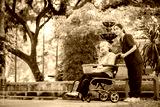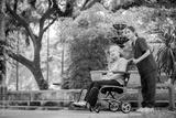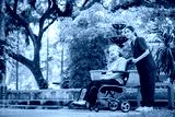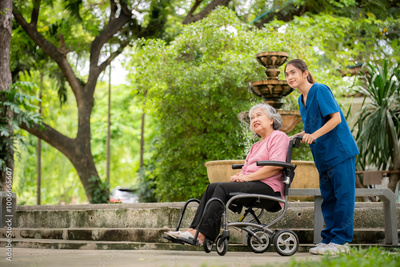 Elderly woman seated in a wheelchair with young caregiver or healthcare worker is standing behind reflects care, compassion, and a supportive relationship the caregiver and elder healthy concept.