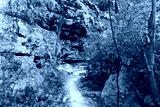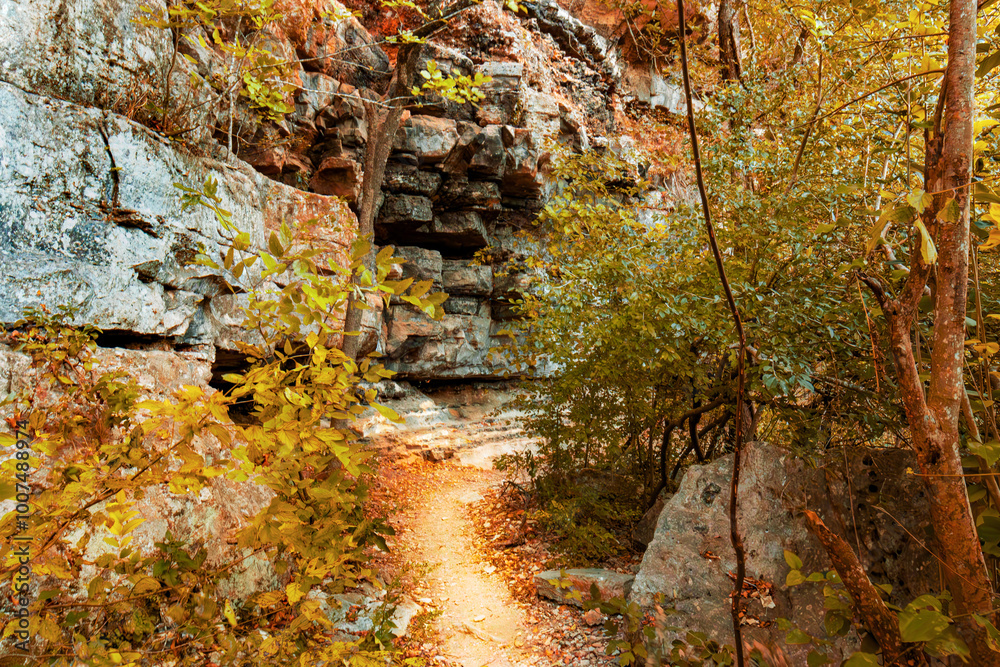 A serene autumn scene along a natural trail in Austin, Texas. The path winds through a vibrant landscape, surrounded by rugged rock formations on the left and lush foliage on both sides.