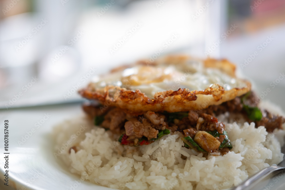 A plate of spicy basil stir fry with pork, topped with a crispy fried egg stunning presentation