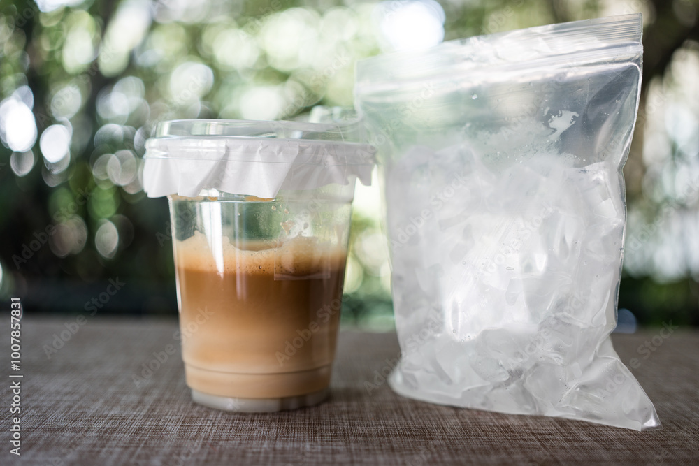 Coffee in a plastic cup with lid cover and ice cubes in a transparent package for delivery to customer at home or office in the morning