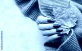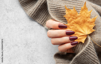 A woman holds a vibrant autumn leaf near her well-manicured hands while wrapped in a cozy sweater during the fall season