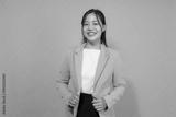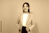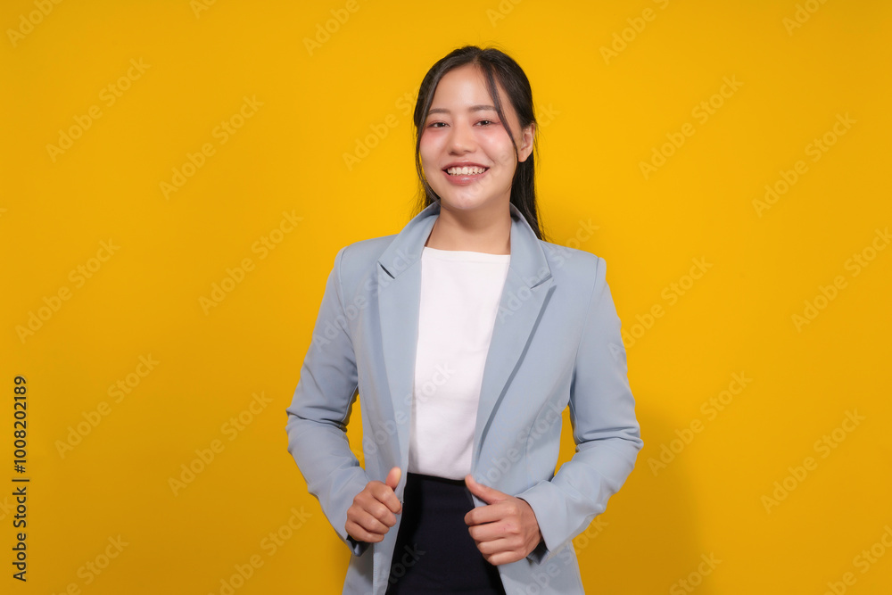 Young asian businesswoman is smiling while wearing a blue blazer and standing in front of a yellow background