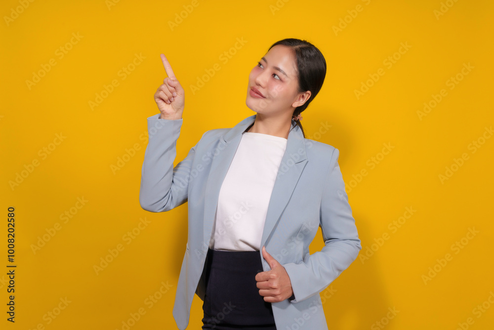 Smiling businesswoman confidently points her finger in a bright yellow office, exuding success and leadership as a young asian executive with a cheerful expression and positive demeanor