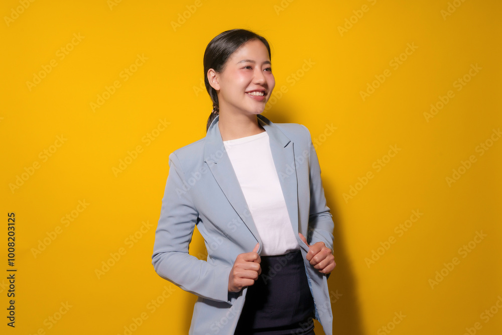 Young professional woman is smiling and adjusting her blazer while standing on a yellow background