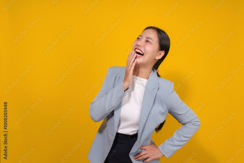 Businesswoman is standing on a yellow background covering her mouth while laughing