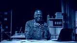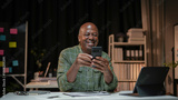 Senior manager is working late and using his smartphone, he is smiling and seems to be having a good time