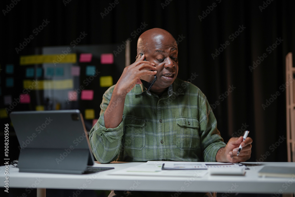 Senior manager is working late in his office, analyzing financial reports and talking on the phone