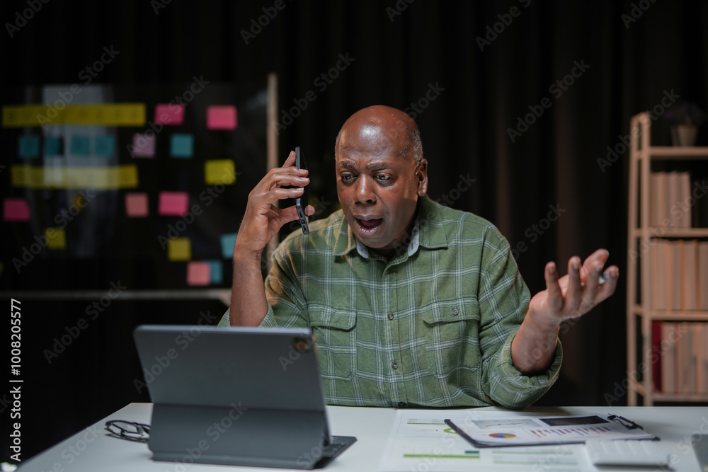 Senior manager is working late in his office and talking angrily on the phone while looking at his tablet