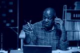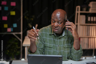 Senior manager is working late in the office at night, having a phone conversation and looking at his laptop
