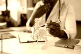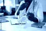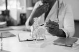 Doctor is using an anatomical model of the spine to explain a diagnosis to a patient