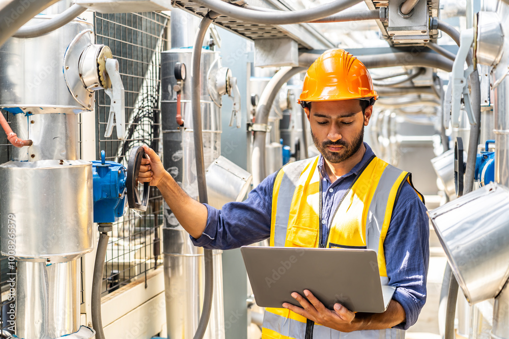 Asian male technical foreman inspects maintenance of turn off the water pipe and looking data in laptop computer, Emergency, plumbing and electrical systems on the roof of a building