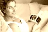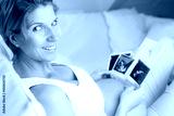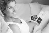Portrait schwangere Frau liegend betrachtet Ultraschallbilder