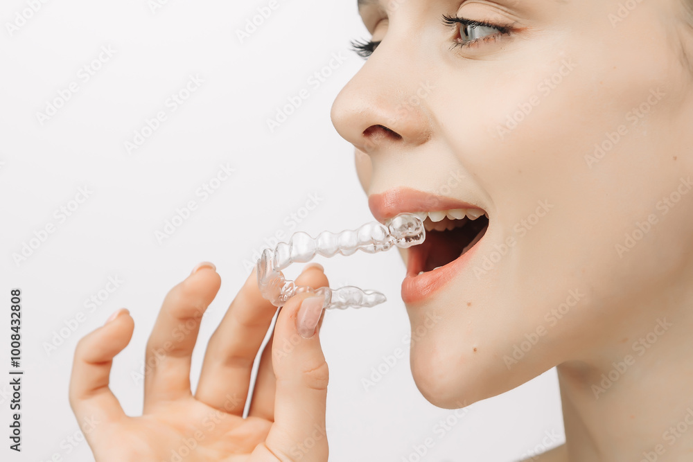 A woman with a beautiful smile and healthy teeth wears an orthodontic silicone trainer. This invisible aligner showcases a modern approach to orthodontics and confidence in her appearance.