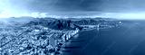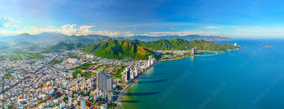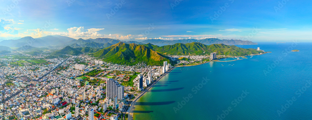 Beautiful Bai Tam Hon Chong beach country overlooking panoramic aerial view city jungle tropical highlands mountains on the coast of Southeast Asia in the day Nha Trang Vietnam.