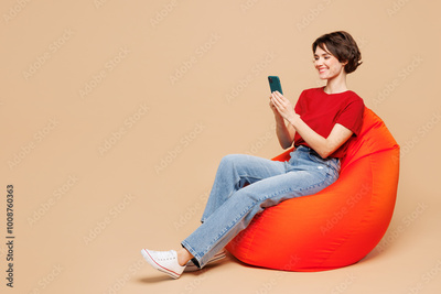 Full body young smiling happy woman she wear red t-shirt casual clothes sit in bag chair hold use mobile cell phone isolated on plain pastel light beige background studio portrait. Lifestyle concept.