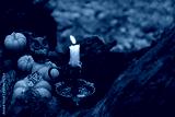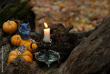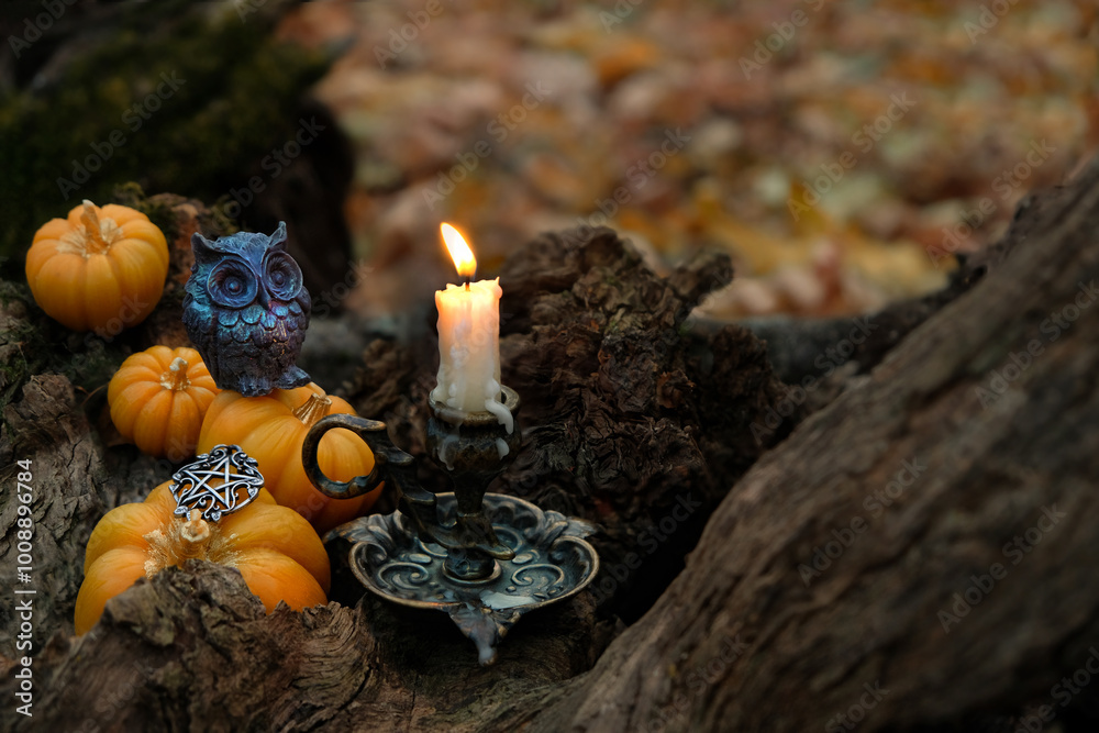 decorative pumpkins and owl figurine and burn candle in autumn forest, dark abstract background. mystery fairy scene. samhain sabbat, Halloween holiday. Witchcraft, magic. esoteric spiritual ritual.