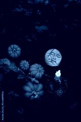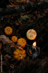 burning candle, decorative pumpkins and moon amulet in forest, dark nature background. Samhain, Halloween. Witchcraft, esoteric spiritual practice. magic ritual. witch aesthetic. autumn equinox