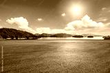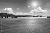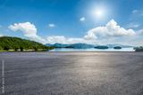 Asphalt road square and clear lake with green mountain nature landscape under blue sky. Car background.