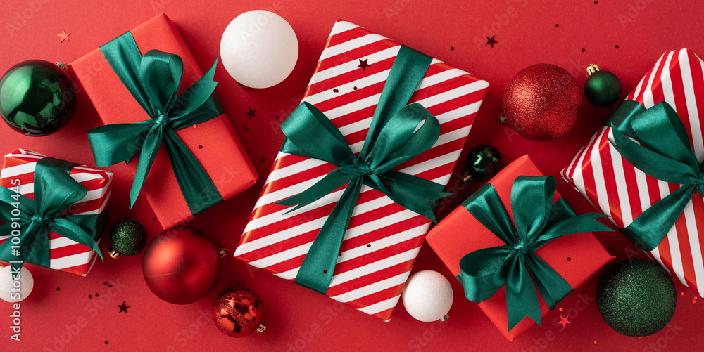 Top view of beautifully wrapped Christmas gifts with green ribbons surrounded by colorful ornaments reflecting festive spirit and joy