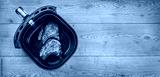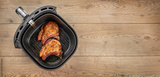 Roast pork steak in airfryer on a wooden table. Long banner format. top view. copy space
