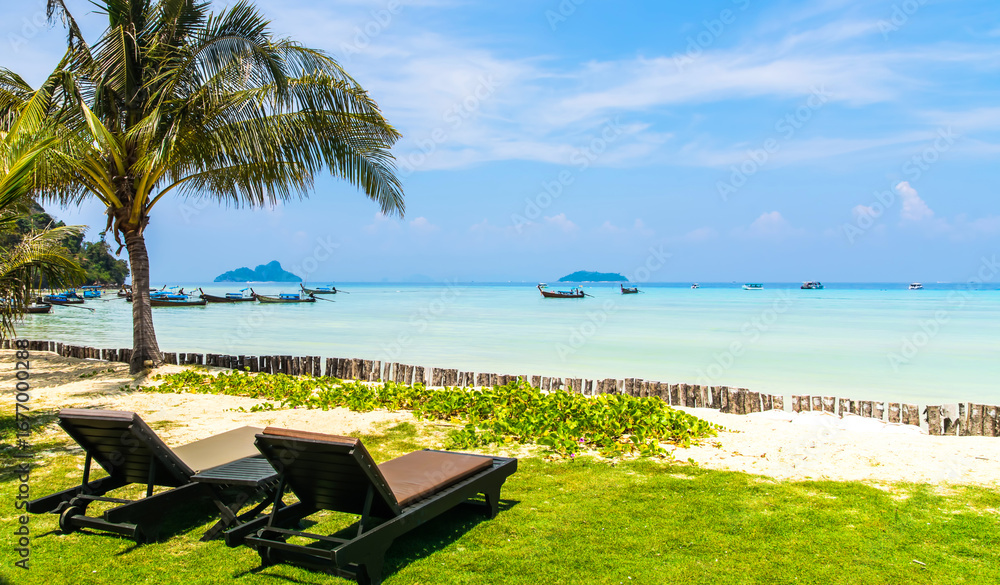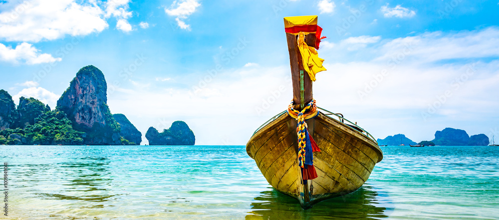 Amazing view of beautiful Ao Nang Beach with longtale boat. Location: Krabi Province, Thailand, Andaman Sea. Artistic picture. Beauty world.