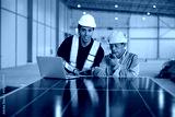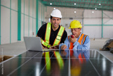 workers or technicians working on laptop computer and checking solar panel in the factory
